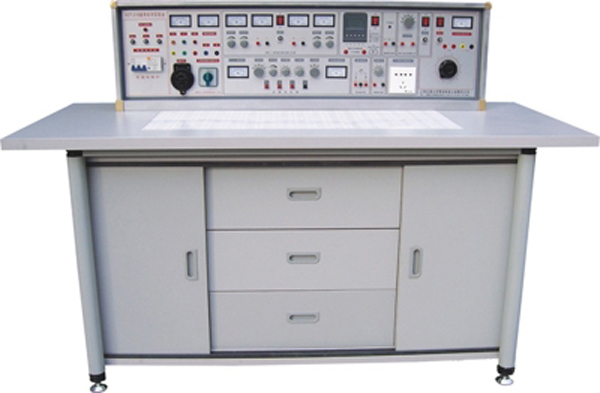一、結(jié)構(gòu)與配備(以二十四座為例) (一) 實(shí)驗(yàn)桌:學(xué)生實(shí)驗(yàn)桌12張,一桌二座,實(shí)驗(yàn)桌外形尺寸為160×70×80cm。桌子中央配置通用九孔電路插板(尺寸:45×70cm)。電路原理實(shí)驗(yàn)部分根據(jù)電路在其上任意拼插元器件實(shí)驗(yàn)盒成實(shí)驗(yàn)電路。元件盒盒體透明直觀,內(nèi)裝元件一目了然,盒蓋印有不會(huì)褪色元件符號(hào),線條清晰美觀。盒體與盒蓋采用較科學(xué)的壓卡式結(jié)構(gòu),維修、拆裝方便。實(shí)訓(xùn)繼電控制部分元器件已裝在特制元件盒上,實(shí)驗(yàn)時(shí)插在通用底板上就能連線實(shí)訓(xùn),方便、靈活。每張操作桌配有一粒膠皮板,保護(hù)通用電路板和桌面(如需要在桌上放置電動(dòng)機(jī)、焊接等) 桌子下部是元器件儲(chǔ)存柜,放置實(shí)驗(yàn)元件器件及工具。