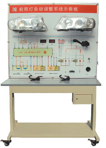 車燈控制單元、左右氙氣大燈總成、車身高度傳感器、組合開關(guān)等。并輔以發(fā)動機(jī)轉(zhuǎn)速控制器,車速控制器,車燈照明LED動態(tài)顯示器等。檢測端子、故障設(shè)置系統(tǒng)、大容量蓄電池或12V開關(guān)電源、大型彩色噴繪電路原理圖、控制面板、可移動臺架、使用說明書及實訓(xùn)指導(dǎo)書等。