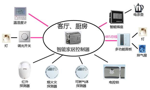 智能電子產(chǎn)品系統(tǒng)網(wǎng)絡(luò)示意圖 1. 家庭控制中心說(shuō)明: 客廳廚房控制中心 客廳廚房控制中心包含智能家居控制器、電控鎖、多功能面板、節(jié)能燈、排氣扇、智能調(diào)光開關(guān)、智能光強(qiáng)及溫濕度計(jì)、智能插座、電茶壺、可燃?xì)怏w探測(cè)器、煙火災(zāi)探測(cè)器及紅外探測(cè)器。 電控鎖通過(guò)智能家居控制器控制門的開啟;多功能面板控制客廳、廚房燈的開關(guān);智能調(diào)光開關(guān)調(diào)節(jié)LED燈的亮度、也可通過(guò)485總線與智能家居控制器通訊,通過(guò)情景模式智能調(diào)節(jié)LED燈的亮度;智能光強(qiáng)及溫濕度計(jì)顯示采集客廳溫濕度及光照度;智能插座控制和采集電茶壺的電源和電量信息,可合理分配用電負(fù)荷;可燃?xì)怏w探測(cè)器、煙火災(zāi)探測(cè)器及紅外探測(cè)器用于組件家居系統(tǒng)的安防系統(tǒng)。 多功能面板、智能調(diào)光開關(guān)、智能光強(qiáng)及溫濕度計(jì)、智能插座通過(guò)485總線與智能家居控制器通訊,可燃?xì)怏w探測(cè)器、煙火災(zāi)探測(cè)器、紅外探測(cè)器及電控鎖通過(guò)I\O口與智能家居控制器通訊。