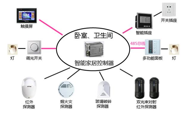 智能電子產(chǎn)品系統(tǒng)客廳廚房安裝配置圖 臥室衛(wèi)生間控制中心 臥室衛(wèi)生間控制中心包含智能家居控制器、觸摸屏、多功能面板、智能調(diào)光開關(guān)、智能插座、煙火災(zāi)探測(cè)器、紅外探測(cè)器、玻璃破碎探測(cè)器、雙光束對(duì)射紅外探測(cè)器。 觸摸屏通過(guò)485與智能家居控制器通訊,可實(shí)現(xiàn)遙控、遙信、遙調(diào)及情景模式的設(shè)定;智能調(diào)光開關(guān)調(diào)節(jié)白熾燈的亮度、也可通過(guò)485總線與智能家居控制器通訊,通過(guò)情景模式智能調(diào)節(jié)白熾燈的亮度;多功能面板控制臥室、衛(wèi)生間燈的開合;智能插座控制和采集相關(guān)用電設(shè)備電源和電量信息,可合理分配用電負(fù)荷;煙火災(zāi)探測(cè)器、紅外探測(cè)器、玻璃破碎探測(cè)器、雙光束對(duì)射紅外探測(cè)器用于組件家居系統(tǒng)的安防系統(tǒng)。 觸摸屏、多功能面板、智能調(diào)光開關(guān)、智能插座通過(guò)485總線與智能家居控制器通訊,煙火災(zāi)探測(cè)器、紅外探測(cè)器、玻璃破碎探測(cè)器及雙光束對(duì)射紅外探測(cè)器通過(guò)I\O口與智能家居控制器通訊。