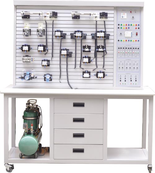 氣動PLC控制實驗臺主要由實驗桌及實驗支架、氣動元器件、電氣控制器件等組成。